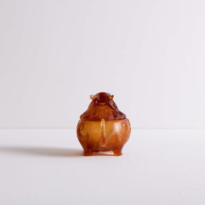 The petite size of this liuli Suanni makes it striking yet not overbearing. It is made from the pate de verre technique using a combination of amber and frosted white glass crystal. Can be used for both burning incense powder and incense sticks. Comes with a bronze incense powder mold and a bronze stand for incense sticks.