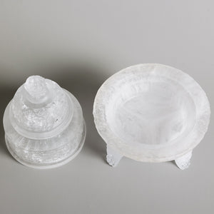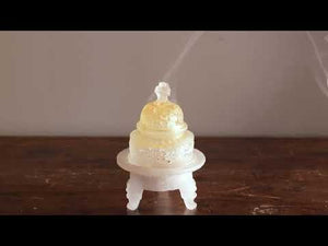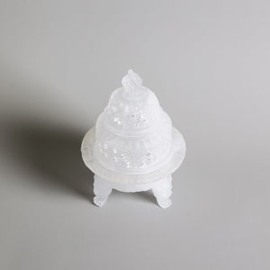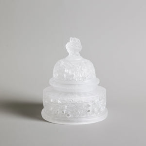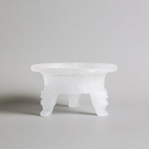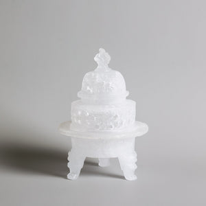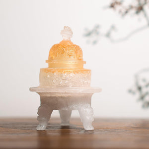 The Monument is a contemporary liuli interpretation of the traditional tri-legged Chinese incense burner, its tiered lid shape characteristic of cloisonne censers of the Qing dynasty palace. The three legs and tip of the lid feature mythical Chinese suanni lions, while the body of the lid is adorned by laced leaf patterns derived from lianli zhi – tree branches from two trees intertwined, a traditional symbol of love and unity.